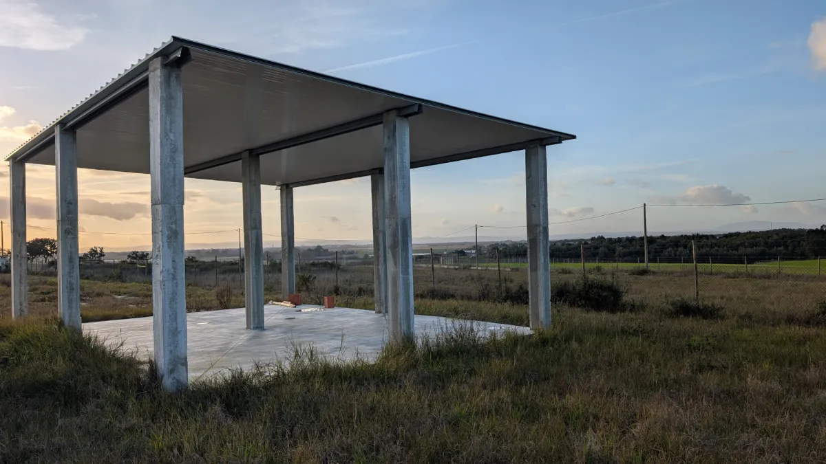 Garagem aberta para 4 carros (ou 1 autocaravana e 2 carros), com cerca de 4 metros de altura